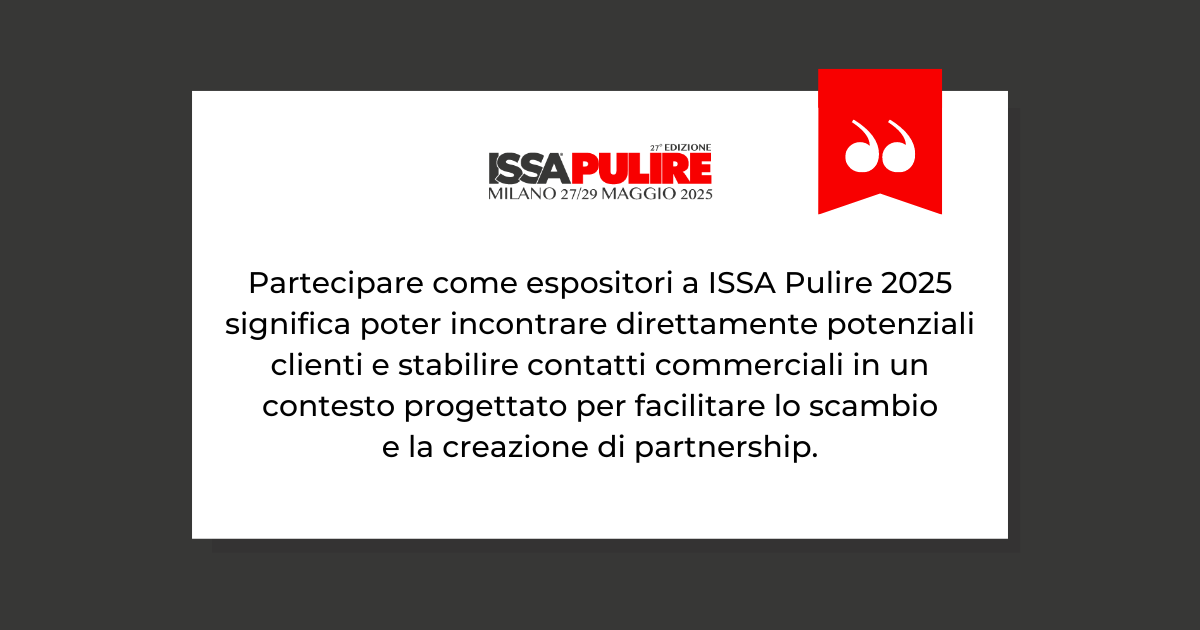 Oltre a rappresentare un punto d’incontro per chi opera nel settore, ISSA PULIRE si pone come hub di innovazione e apprendimento, dove le ultime tecnologie, prodotti e metodologie vengono esposti, discussi e valorizzati. La visibilità delle aziende espositrici riceve una spinta significativa grazie all'ampia copertura mediatica dell'evento, ai canali di comunicazione dedicati e alla presenza di un pubblico fortemente targettizzato. Presentare le proprie innovazioni a questo evento non solo consente di evidenziare e mantenere la propria leadership nel settore, ma apre anche le porte a opportunità di crescita ed espansione in nuovi mercati.